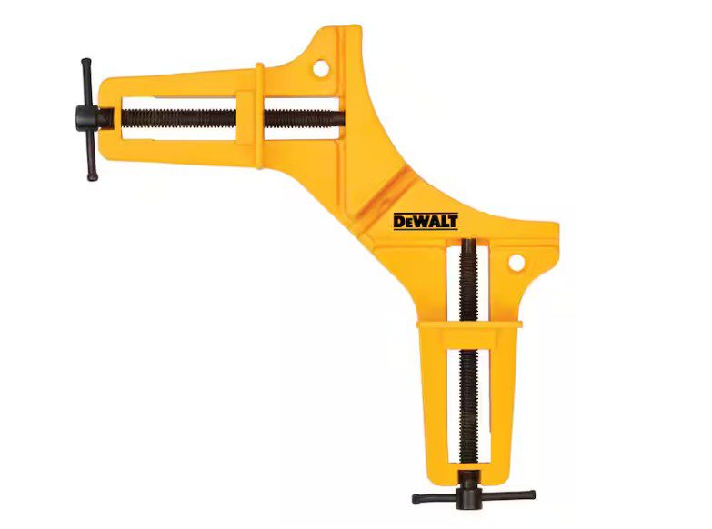 - The DEWALT DWHT83840 90° Corner Clamp is engineered to hold two workpieces at a precise right angle, making it ideal for projects that require accurate corner alignment. Its 3‑inch jaw opening accommodates a wide range of material sizes, while the 200‑lb clamping force keeps pieces firmly secured during assembly. Constructed with a durable steel body, the clamp offers stable, hands‑free support and can be mounted to a workbench for added control during woodworking or DIY tasks.