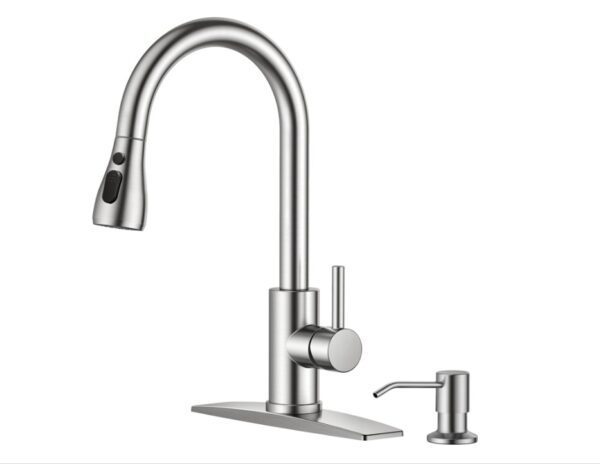• The FORIOUS FF0023C‑SD Kitchen Faucet combines a high‑arc pull‑down sprayer with a smooth single‑handle design to deliver convenient, efficient control of water flow and temperature. Its dual‑mode sprayer switches easily between stream and spray for rinsing, filling, and everyday cleaning, while the 360‑degree swivel spout provides full sink coverage. Made with a durable brushed‑nickel finish, it resists fingerprints and corrosion for long‑lasting use. The included built‑in soap dispenser adds extra convenience, keeping your sink area organized and functional.